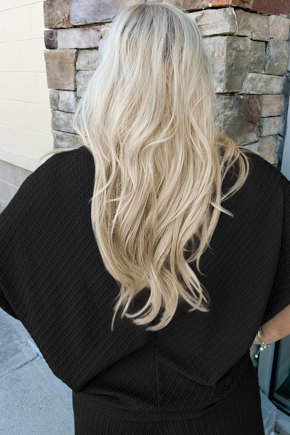 Schwarzes strukturiertes T-Shirt mit Fledermausärmeln und weiten Hosen in Übergröße