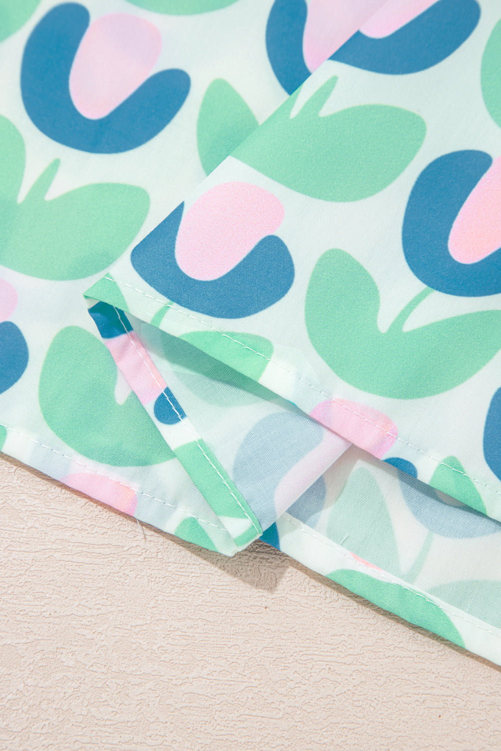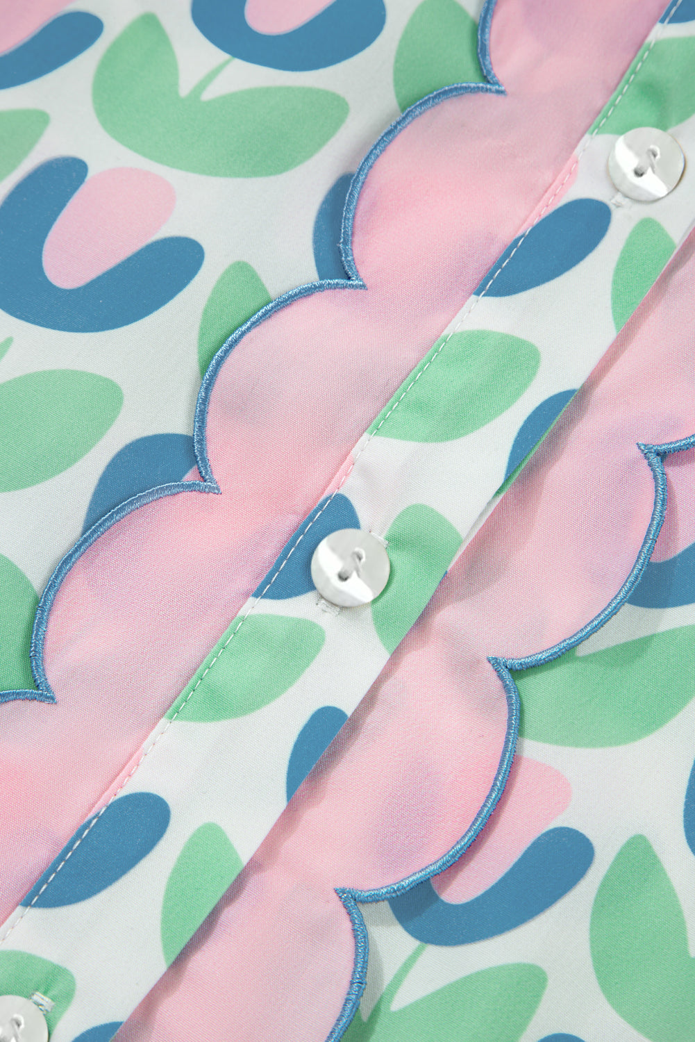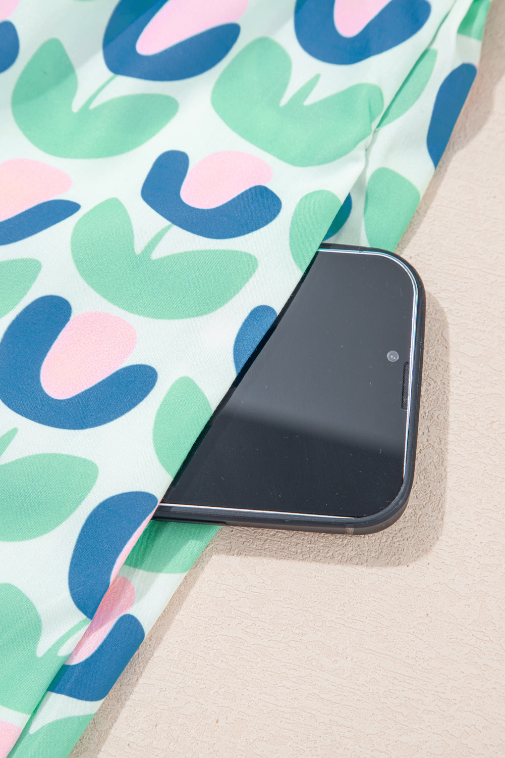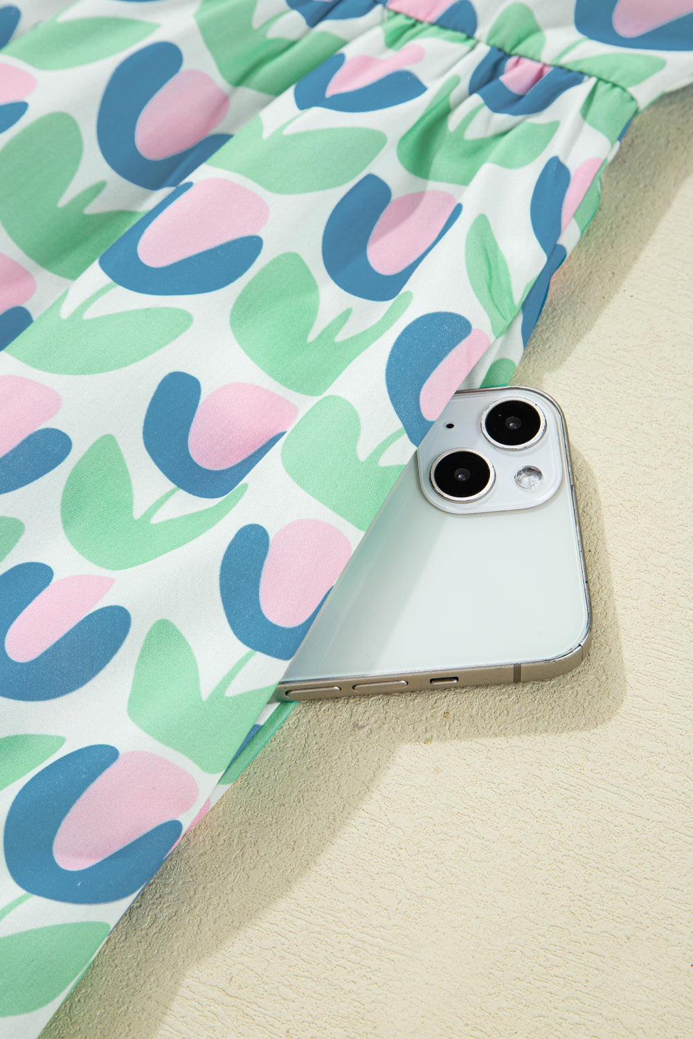 Green Floral Print Notched Neck Scalloped Detail Long Sleeve Mini Dress