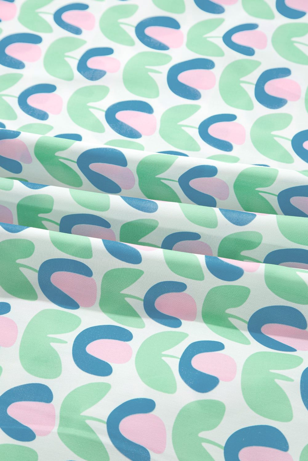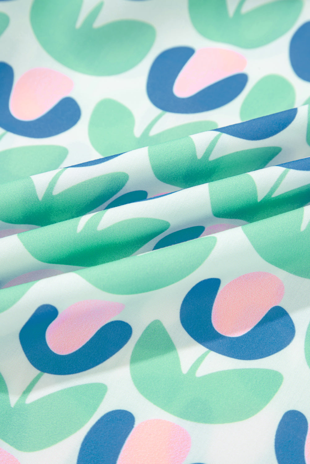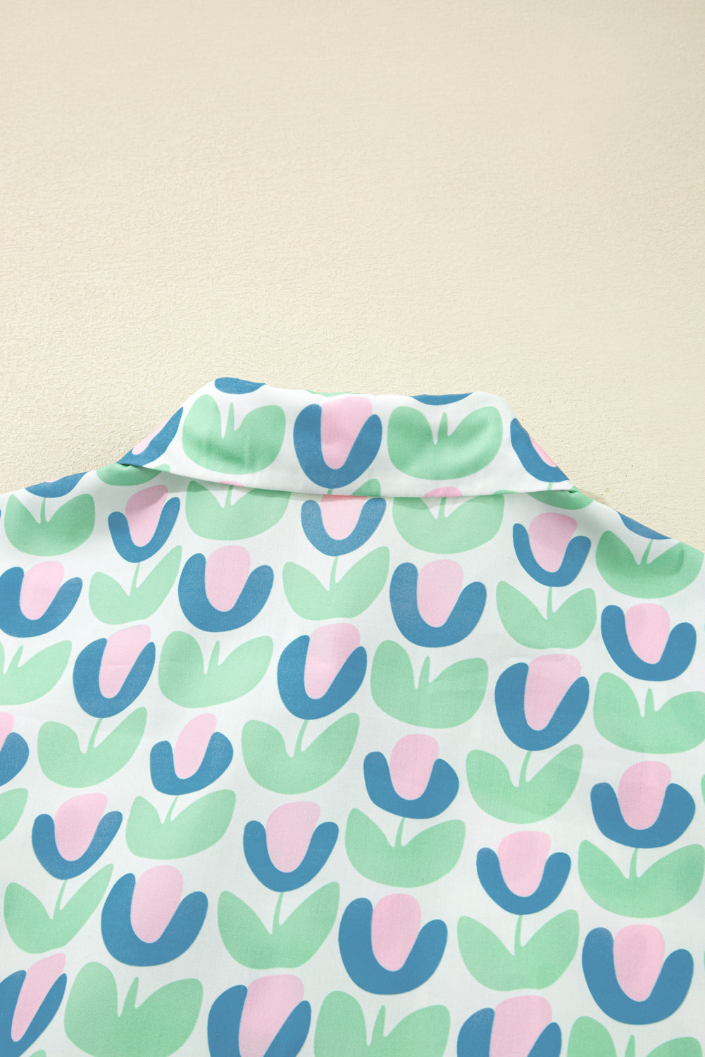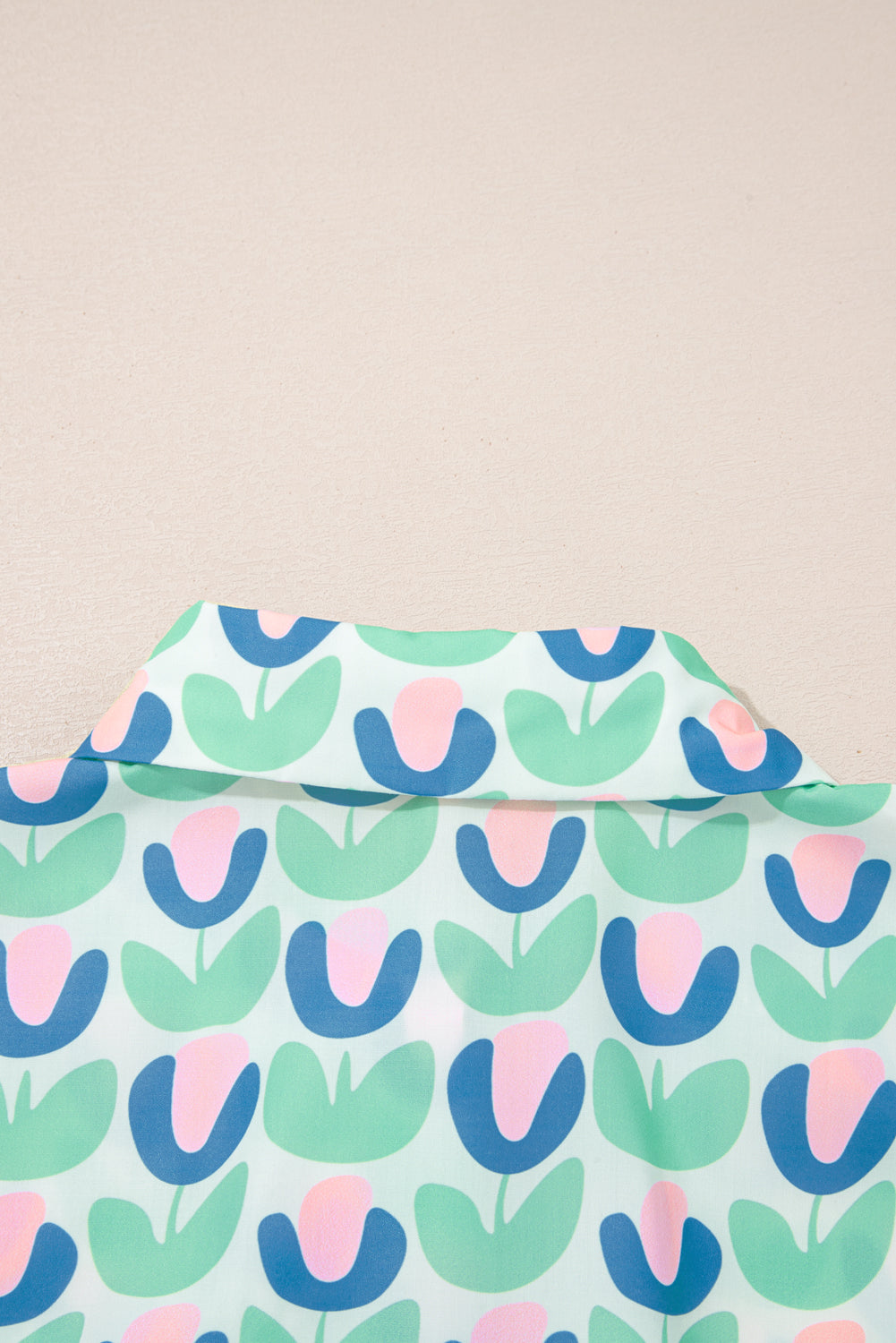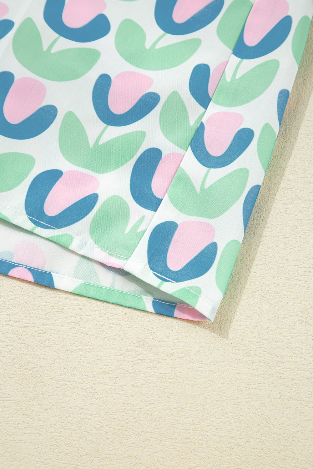 Green Floral Print Notched Neck Scalloped Detail Long Sleeve Mini Dress