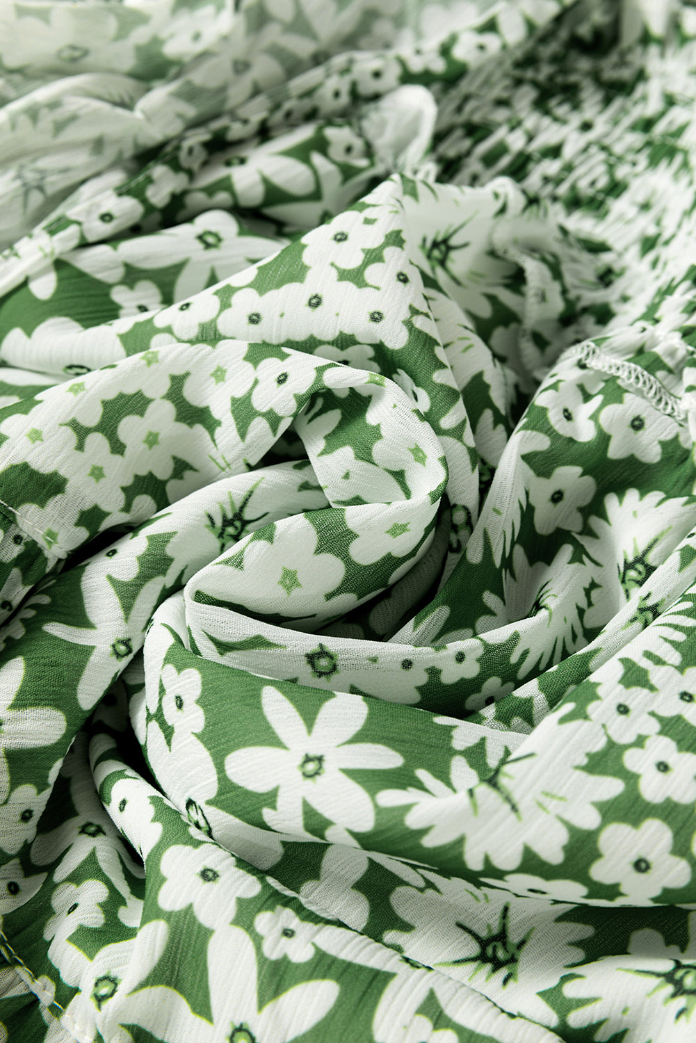 Grünes Minikleid mit Blumenmuster, quadratischem Ausschnitt, geraffter Taille und Rüschen