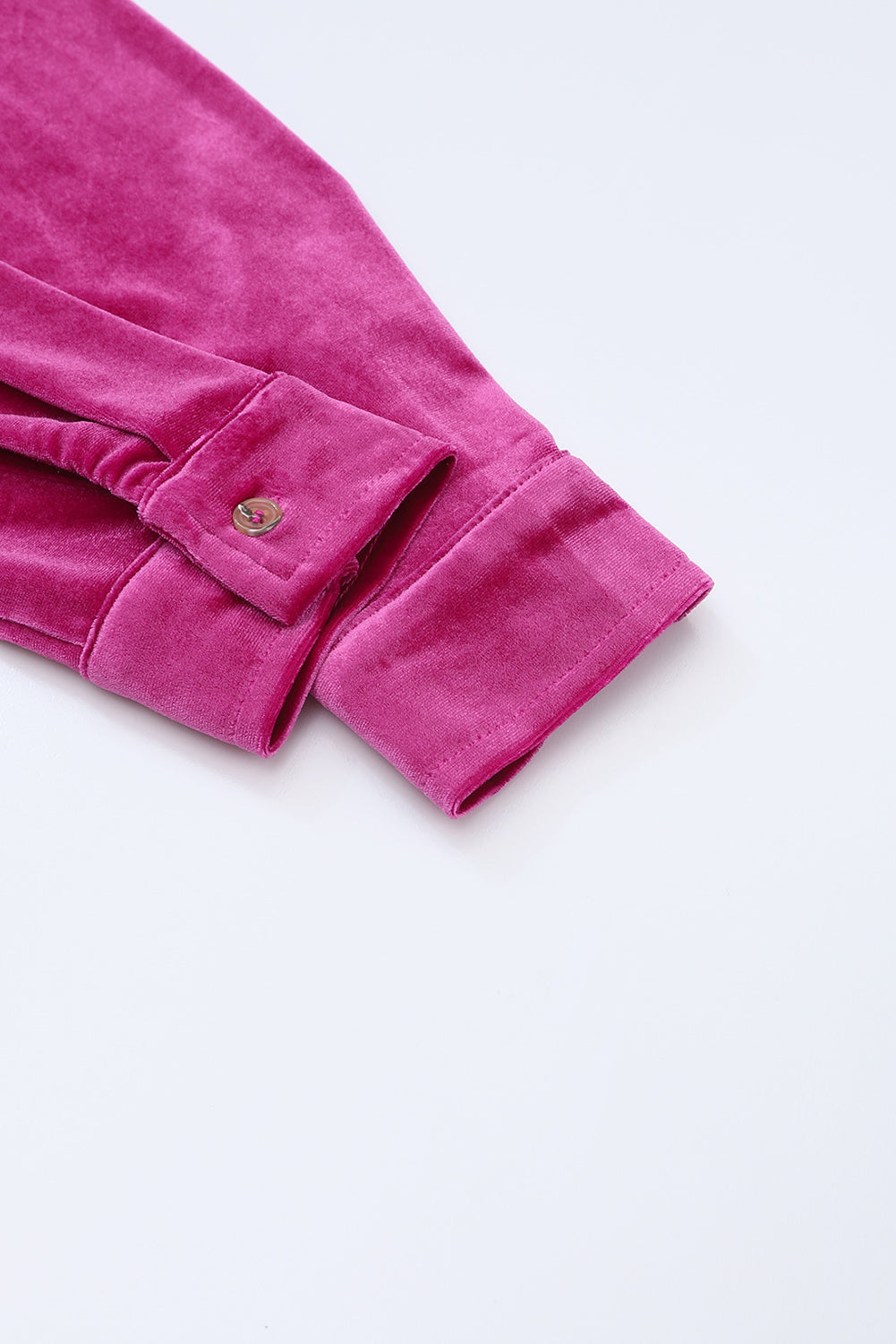Rosafarbenes, langärmliges Samtkleid mit Rüschen und Knopfleiste