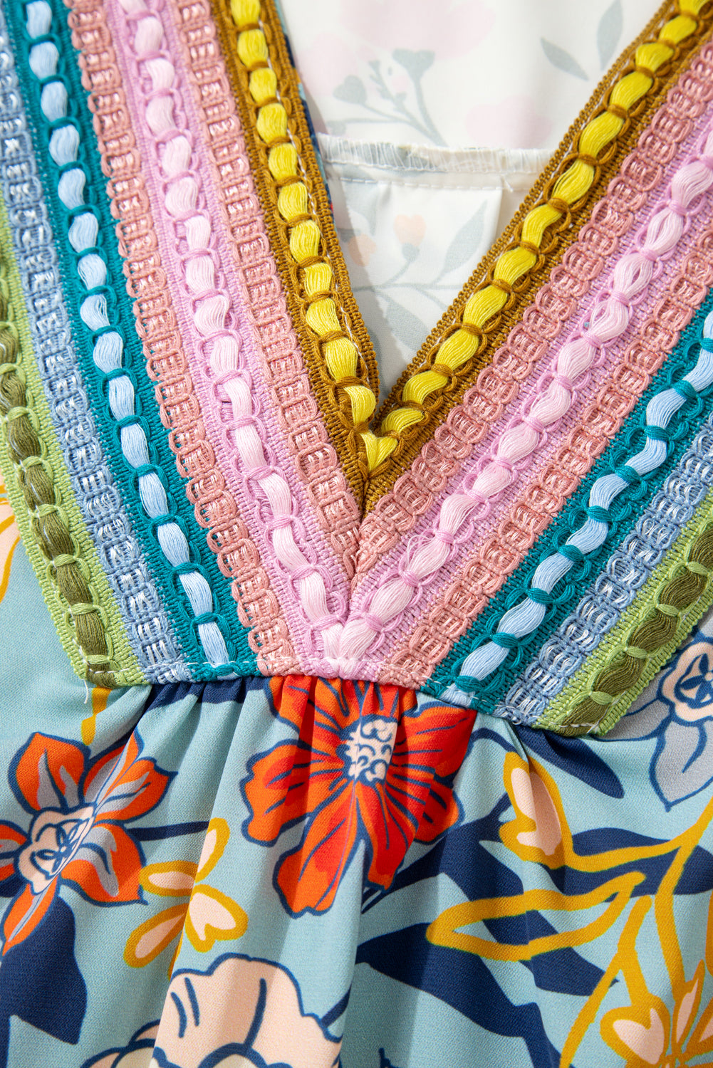 Crochet trim enhances the V neck with delicate boho detail.