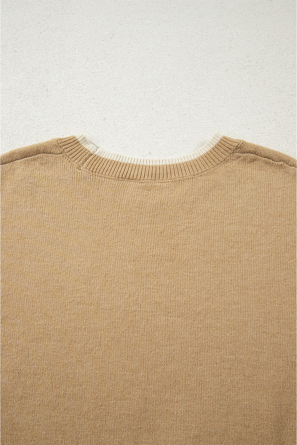 Tan Leopard Bow Decor Split Cuff Contrast Trim Sweater