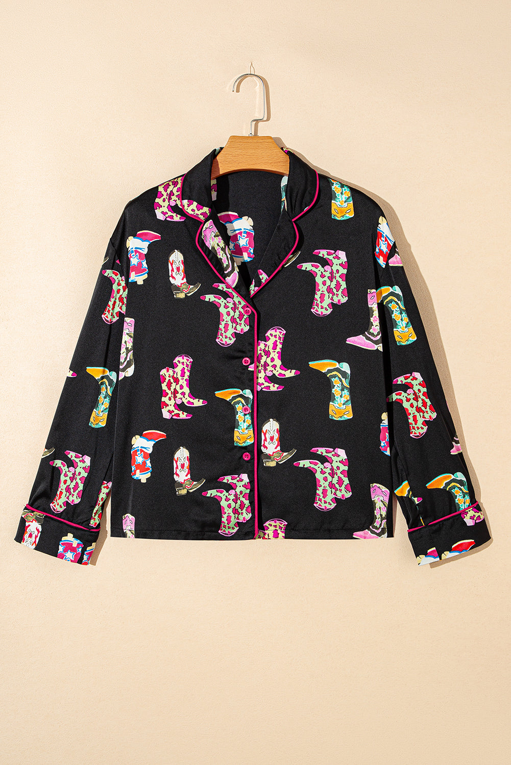 Black Western Cowgirl Boots Printed Satin Long Pajama Set