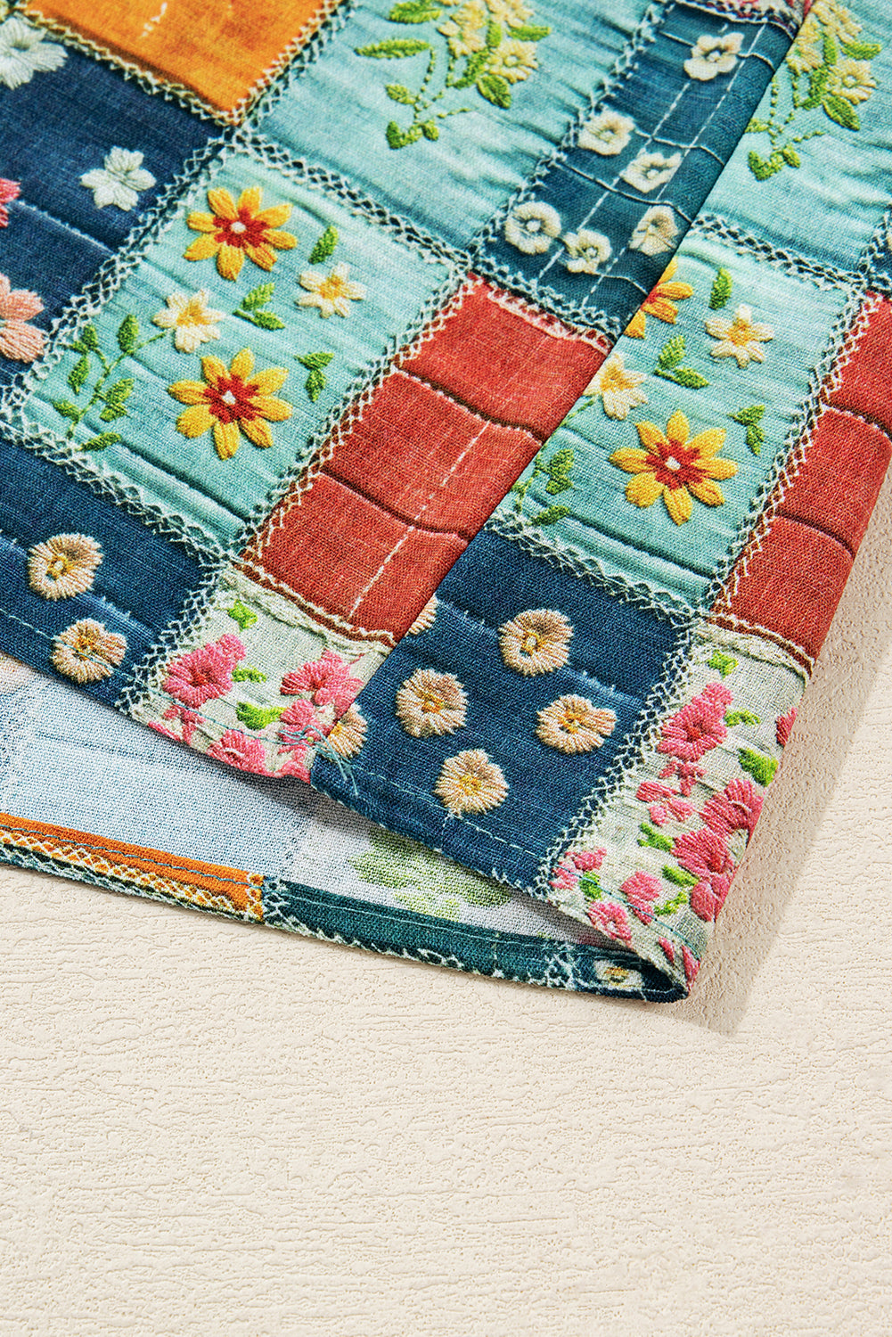 Sky Blue Floral Collared V Neck Roll up Sleeve Shift Blouse