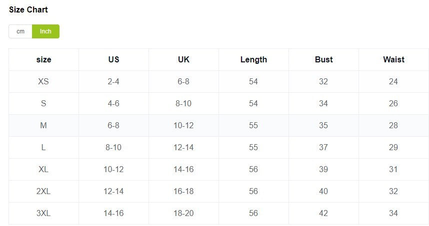 | Size | US | UK | Length | Bust | Waist |