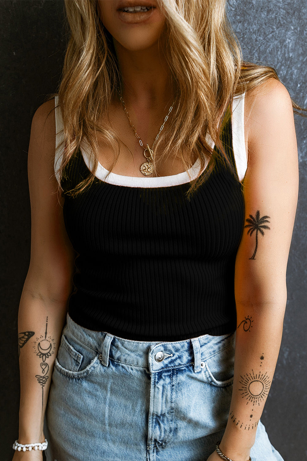 Black Colorblock Edge Ribbed Knit U Neck Tank Top