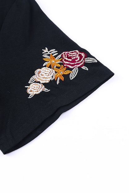 Black Floral Embroidered Round Neck Short Sleeve T Shirt