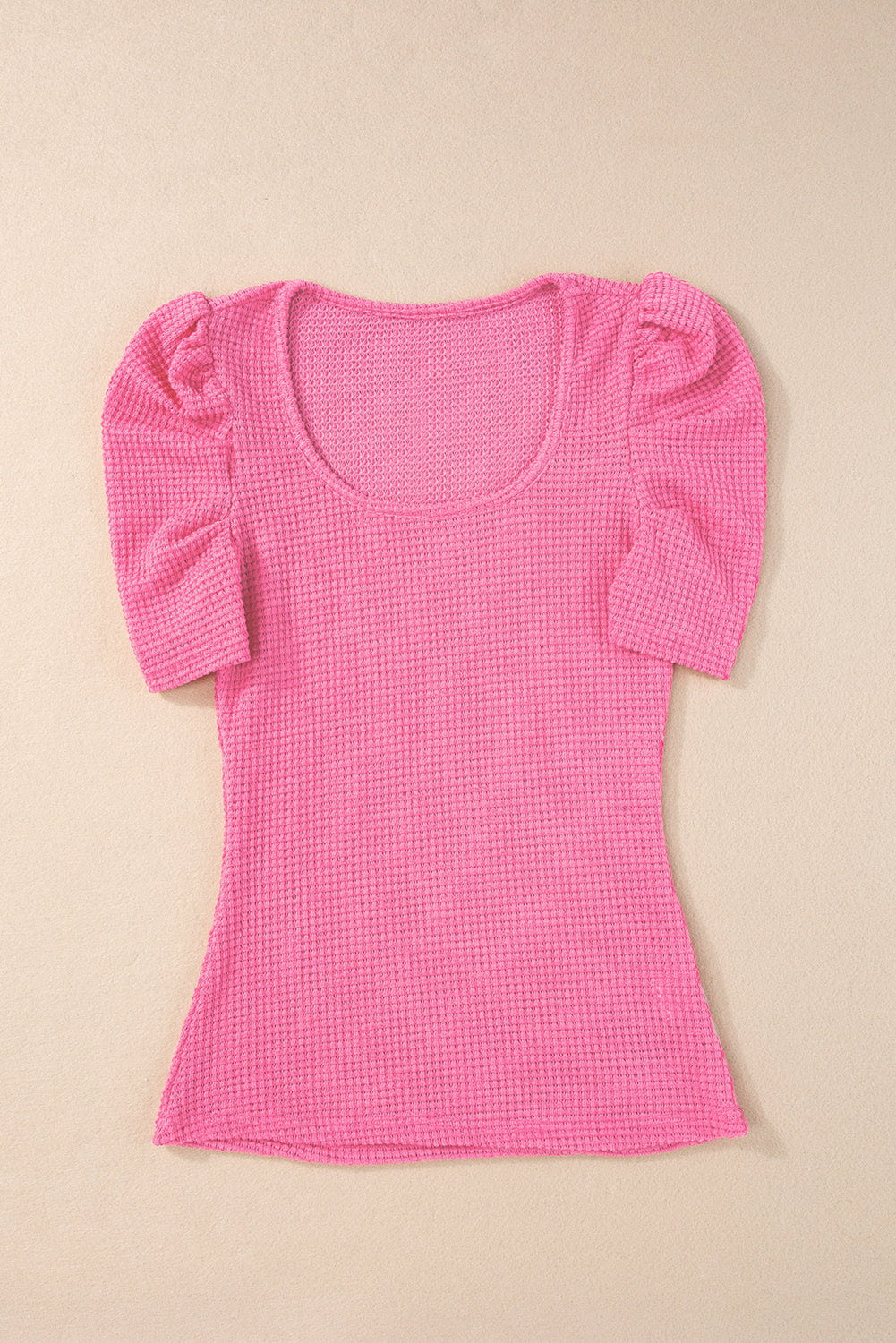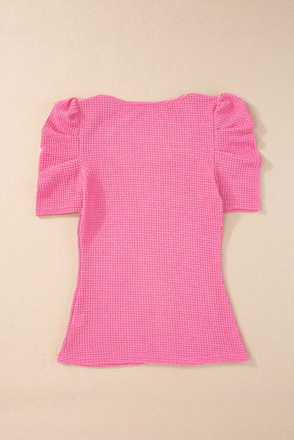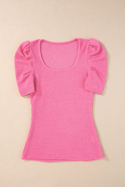 Bright Pink Waffle Knit Ruched Puff Sleeve Top