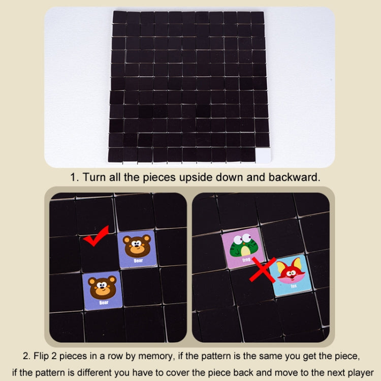 2. Flip 2 pieces in a row by memory, if the pattern is the same you get the piece, if the pattern is different you have to cover the piece back and move to the next player