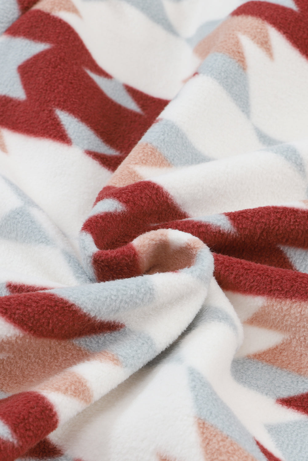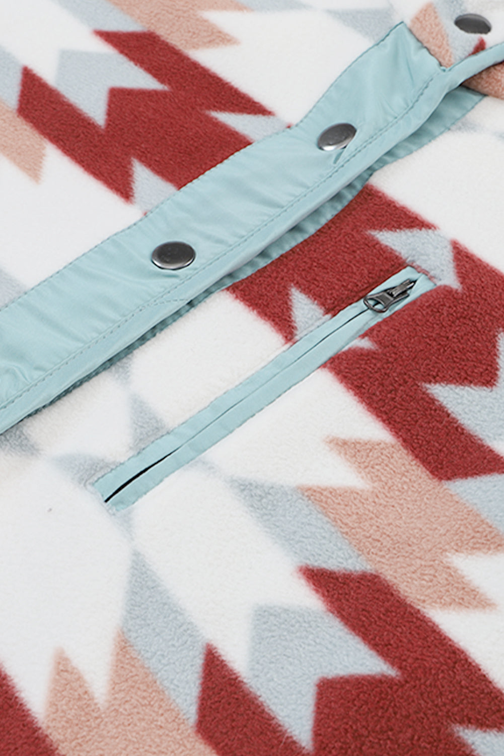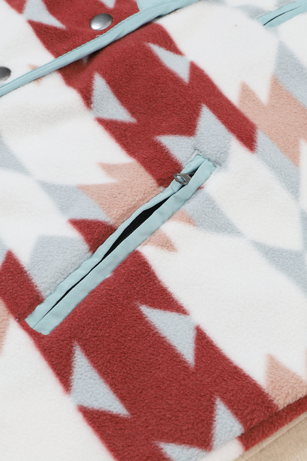 Fiery Red Western Aztec Buttoned Zipper Pockets Fleece Jacket