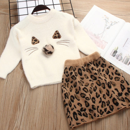 Girl Solid Color Sweater Mink Velvet + Leopard Skirt Two-piece (Color:Beige Size:90)