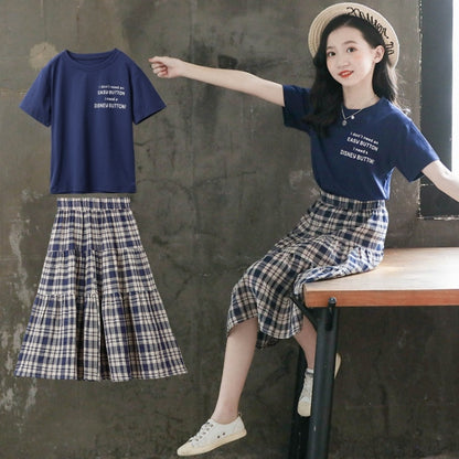 Girls Short Sleeve + Plaid Skirt Two-piece Suit (Color:Blue Size:110)