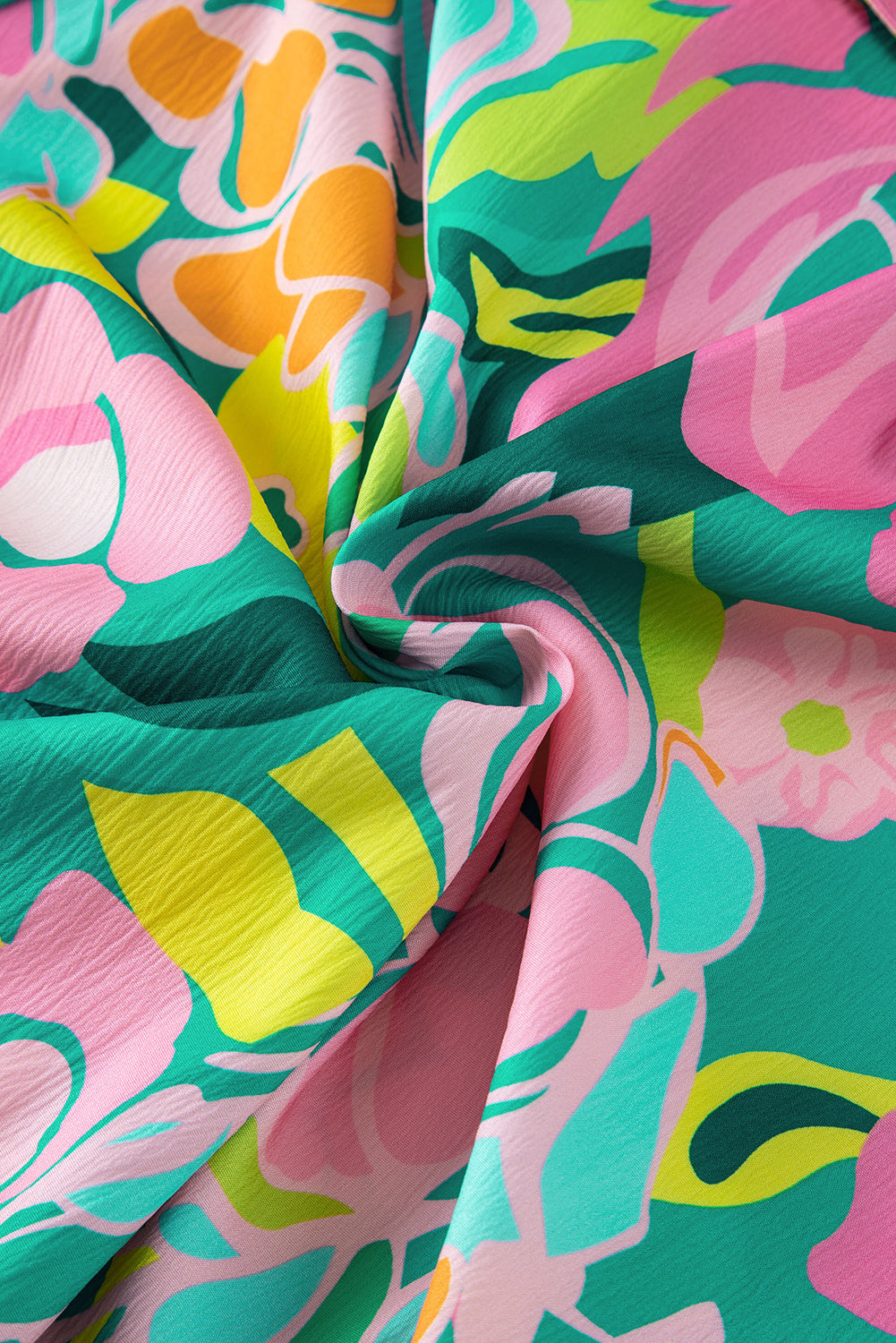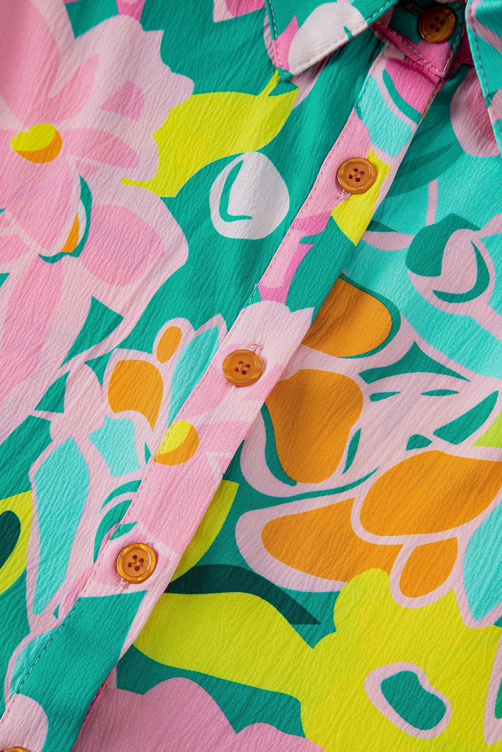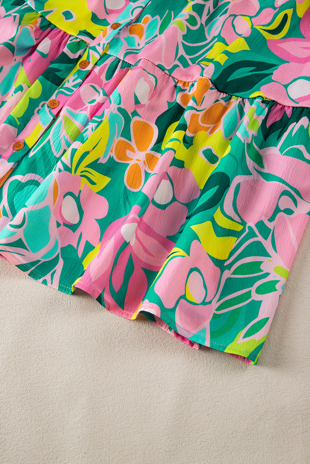 Green Floral Puff Sleeve Collar Buttoned Babydoll Dress