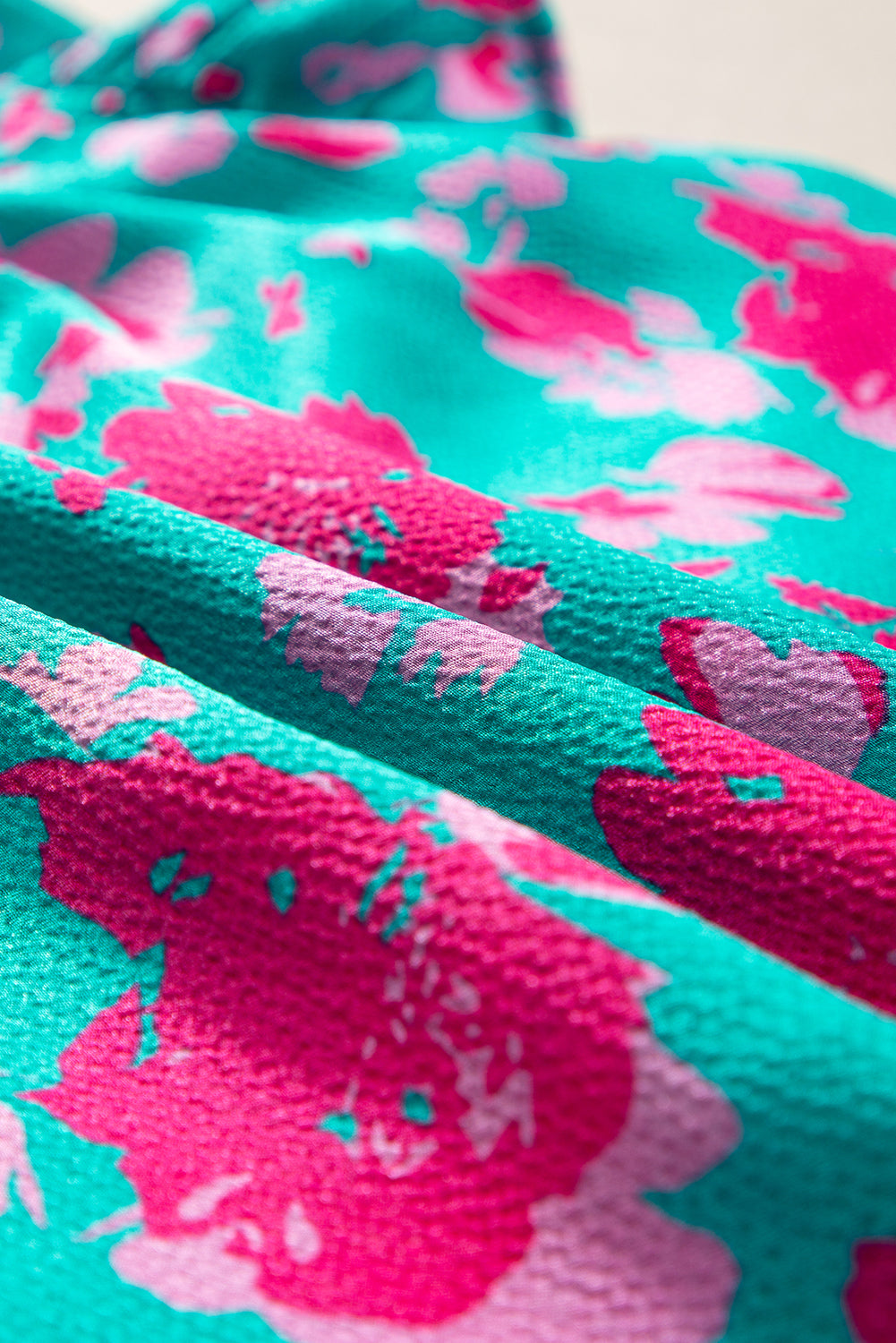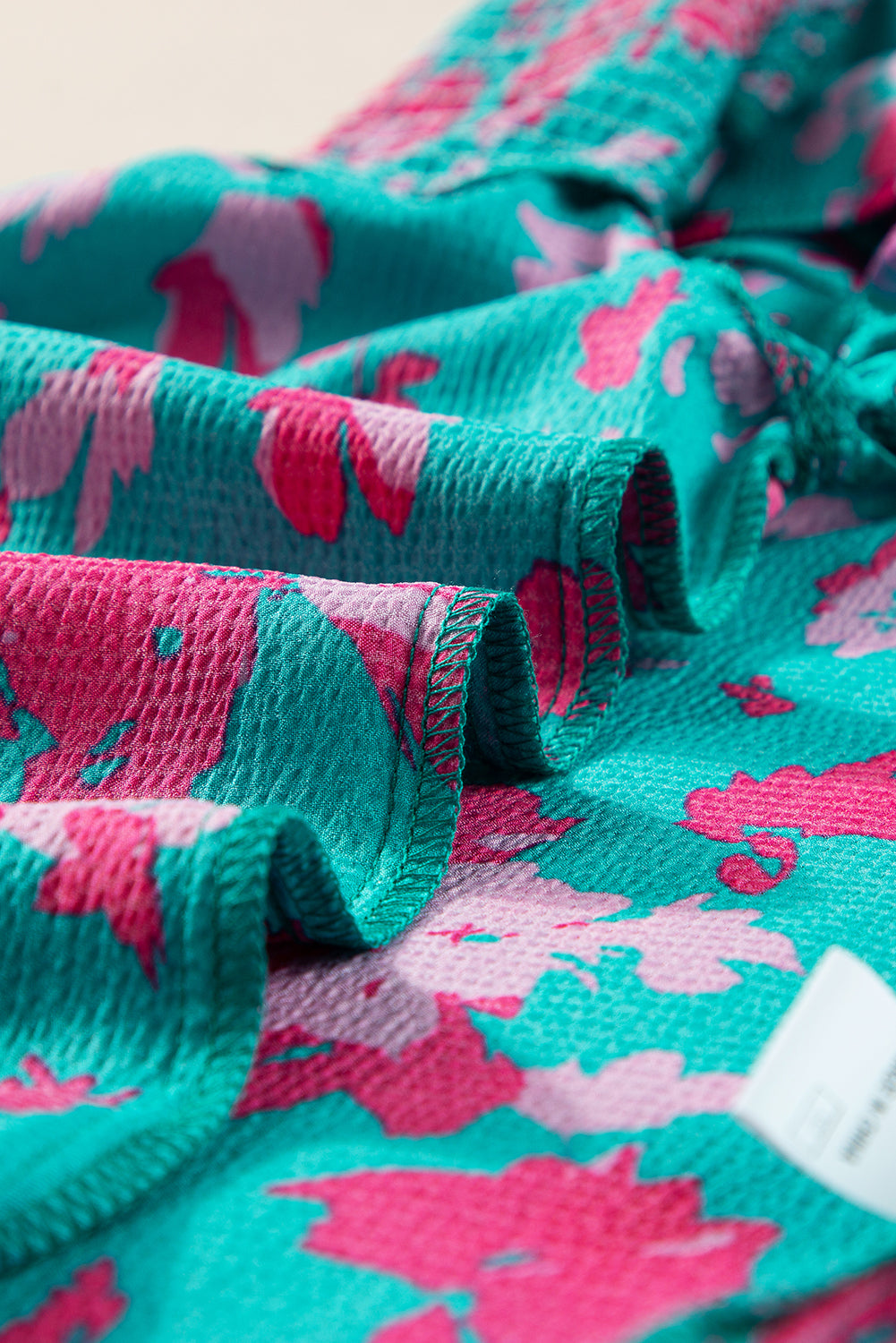 Green Floral Ruffled Flutter Sleeve Ruched Blouse