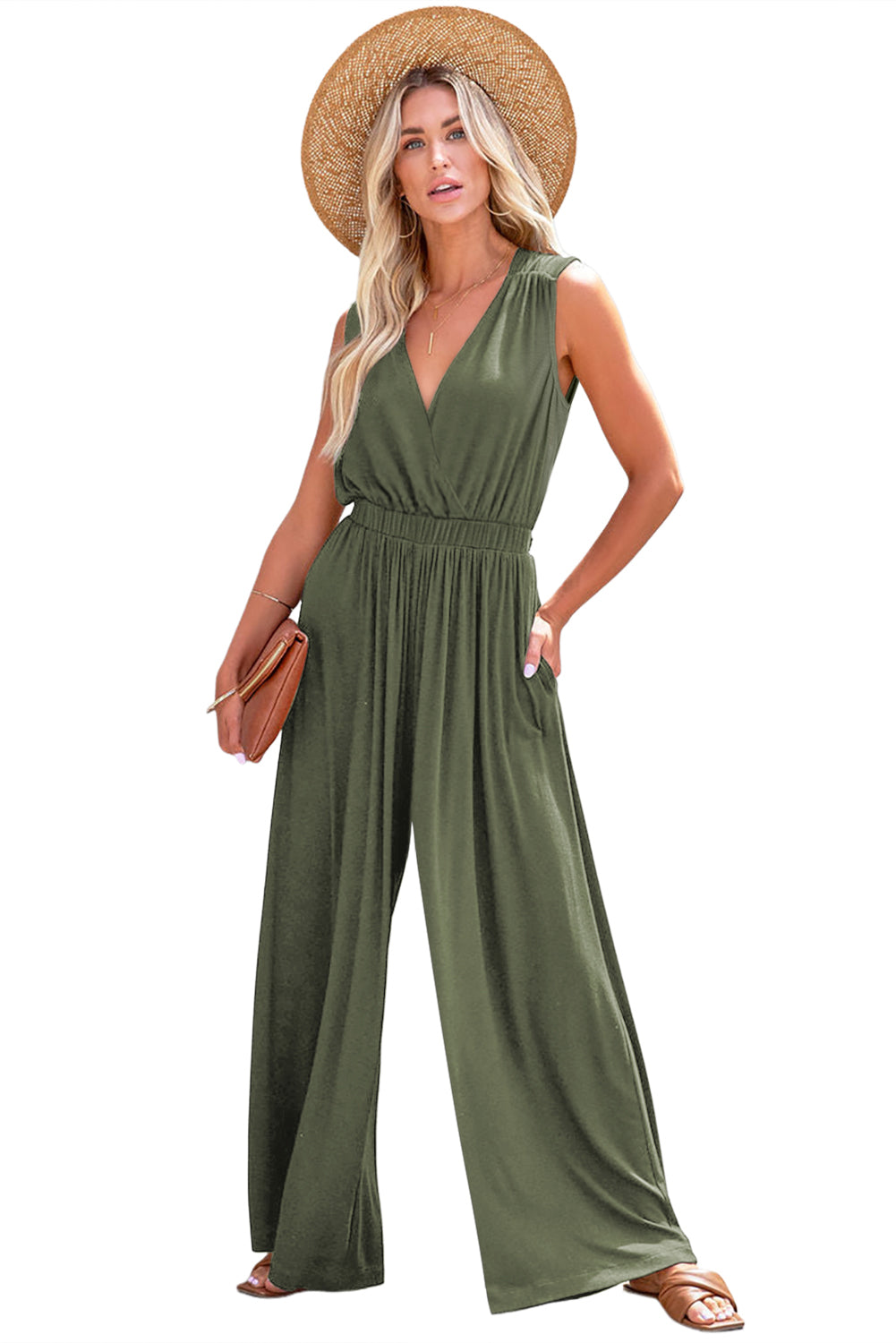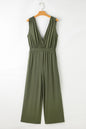 Jungle Green Deep V Pleated Crisscross Wide Leg Backless Jumpsuit