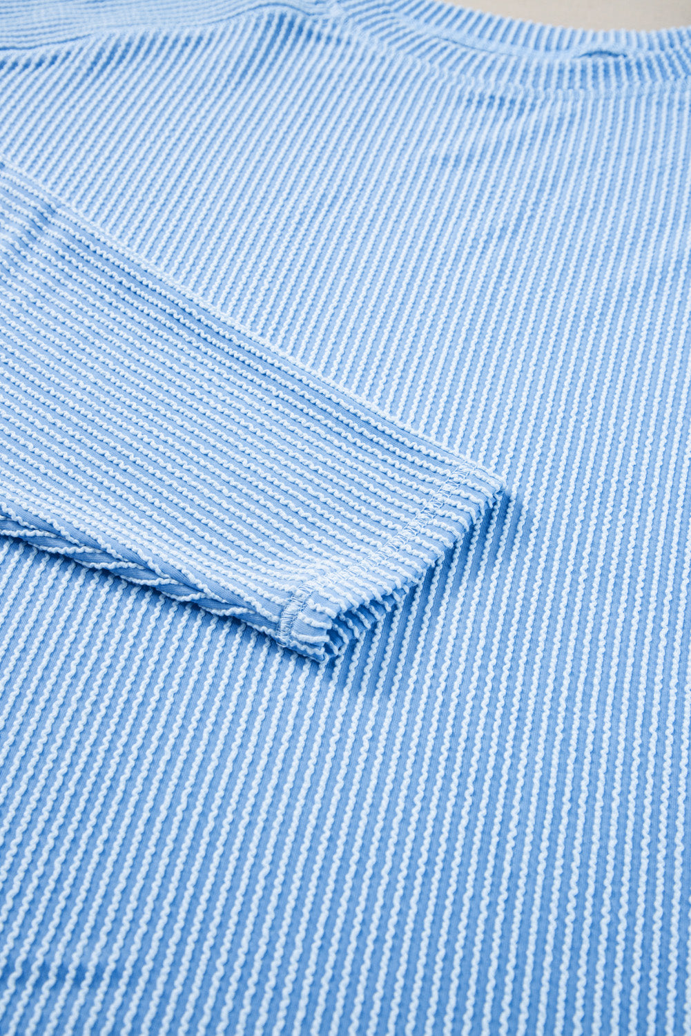 Light Blue Plus Size Ribbed Long Sleeve Top and Drawstring Shorts Set