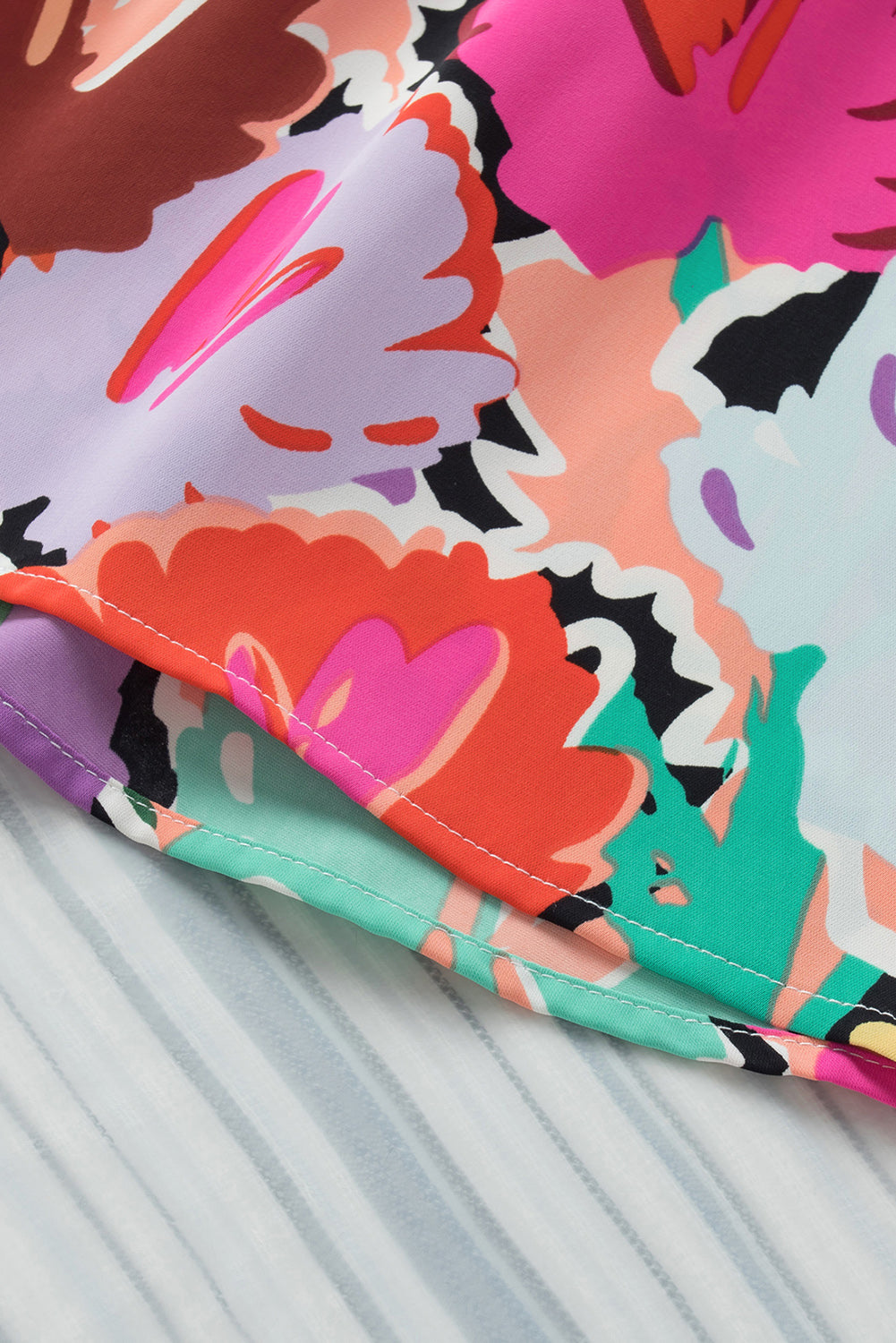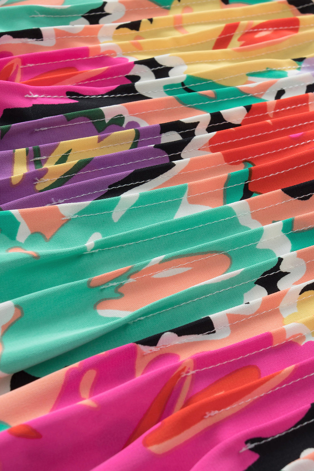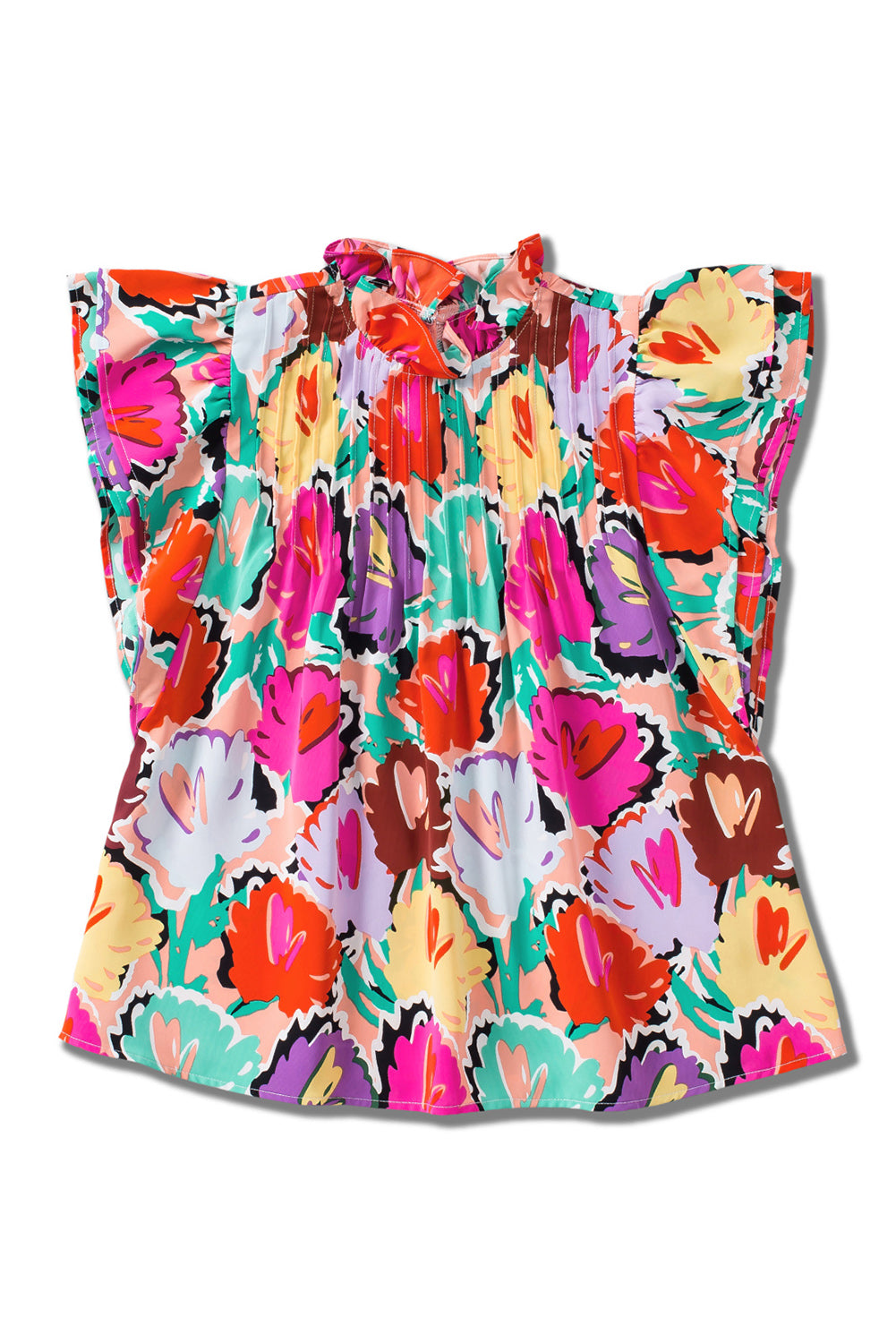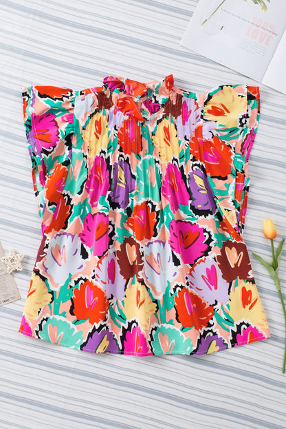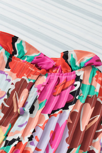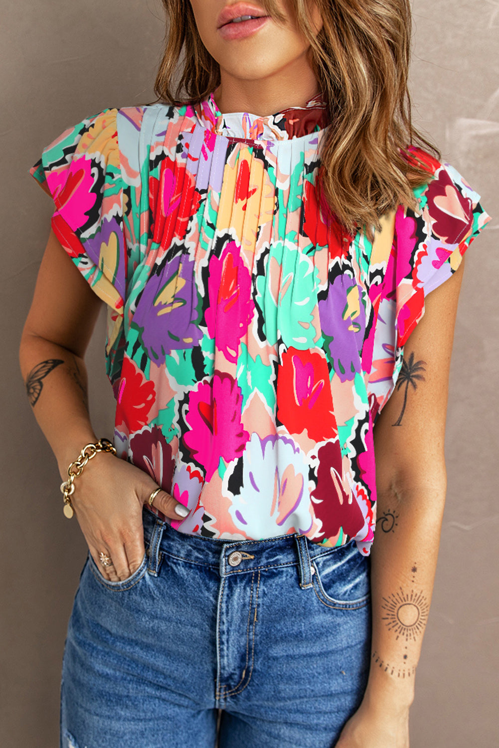 Multicolor Abstract Floral Print Frilled Neck Pleated Blouse