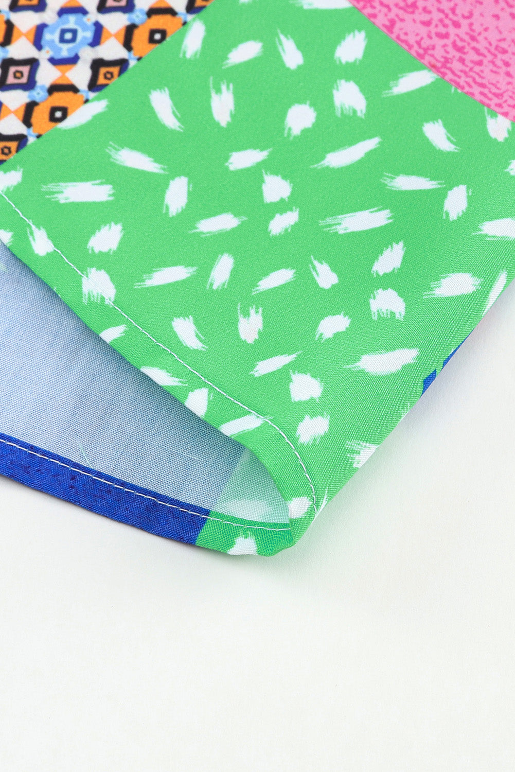 Multicolor Floral Patchwork Print Buttoned Puff Sleeve Shirt