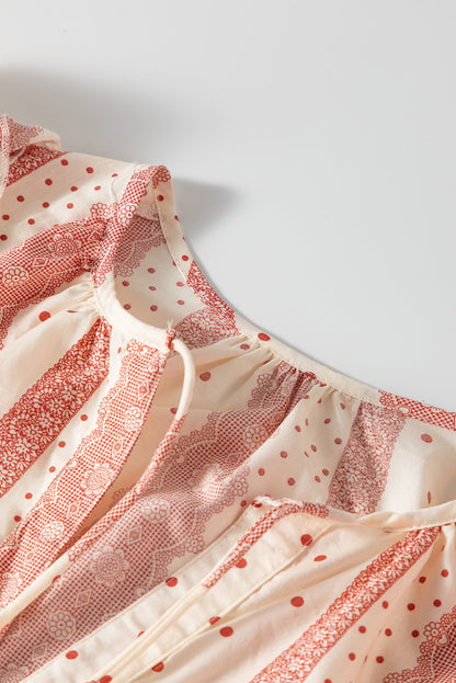 Red Frilled Short Puff Sleeve Mixed Print Blouse