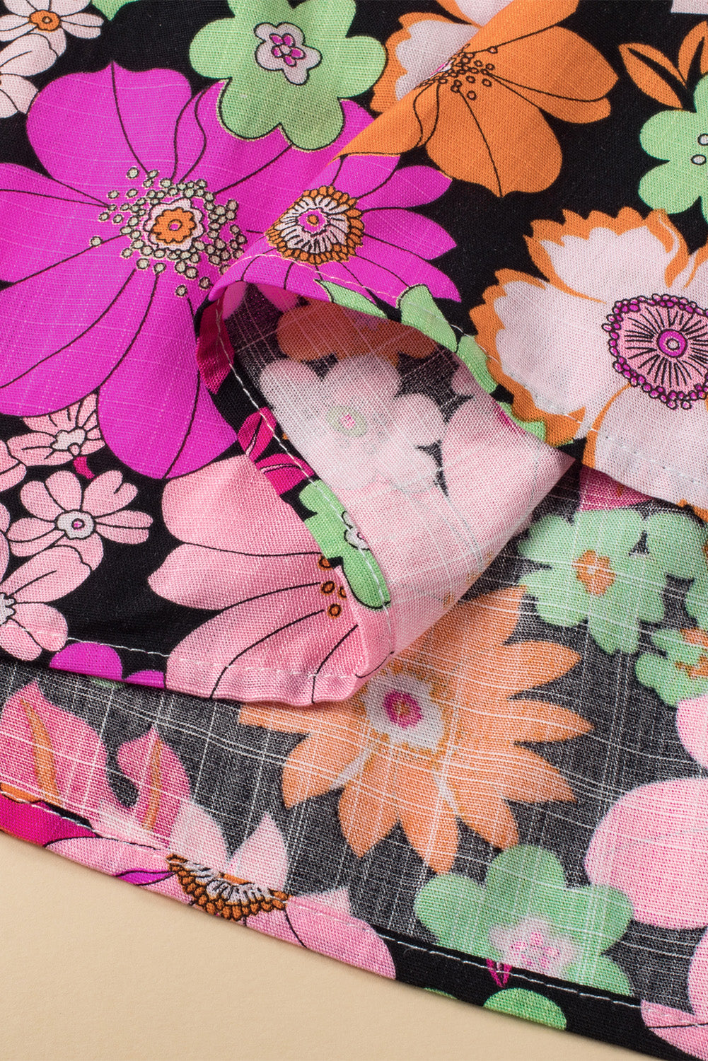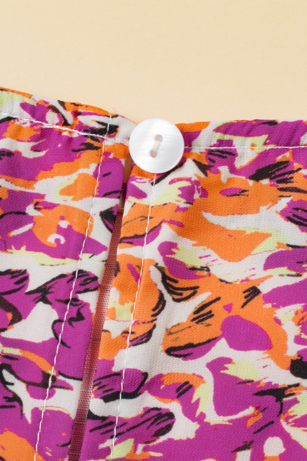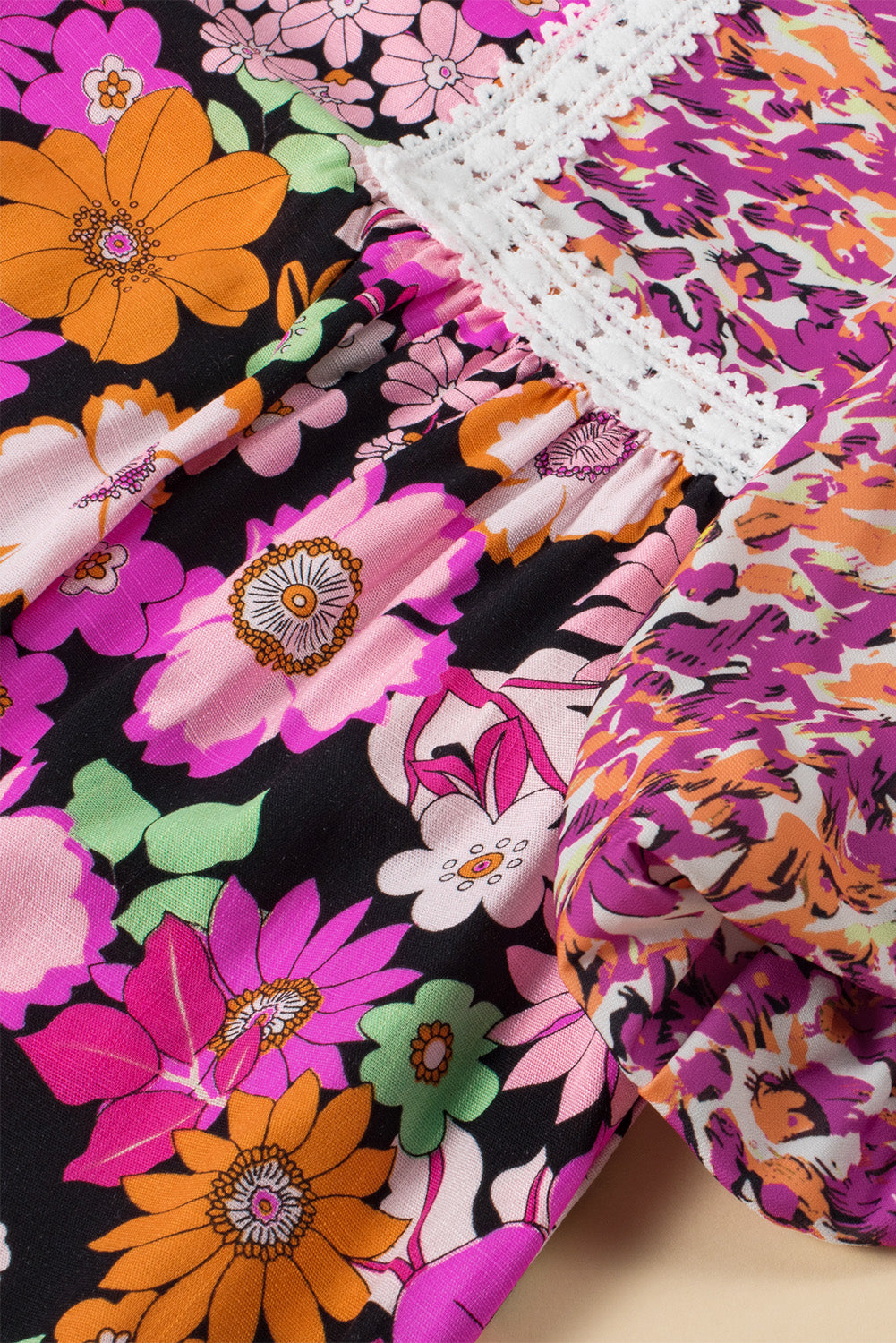 Rose Red Bubble Sleeve Lace Trim Floral Mixed Print Blouse