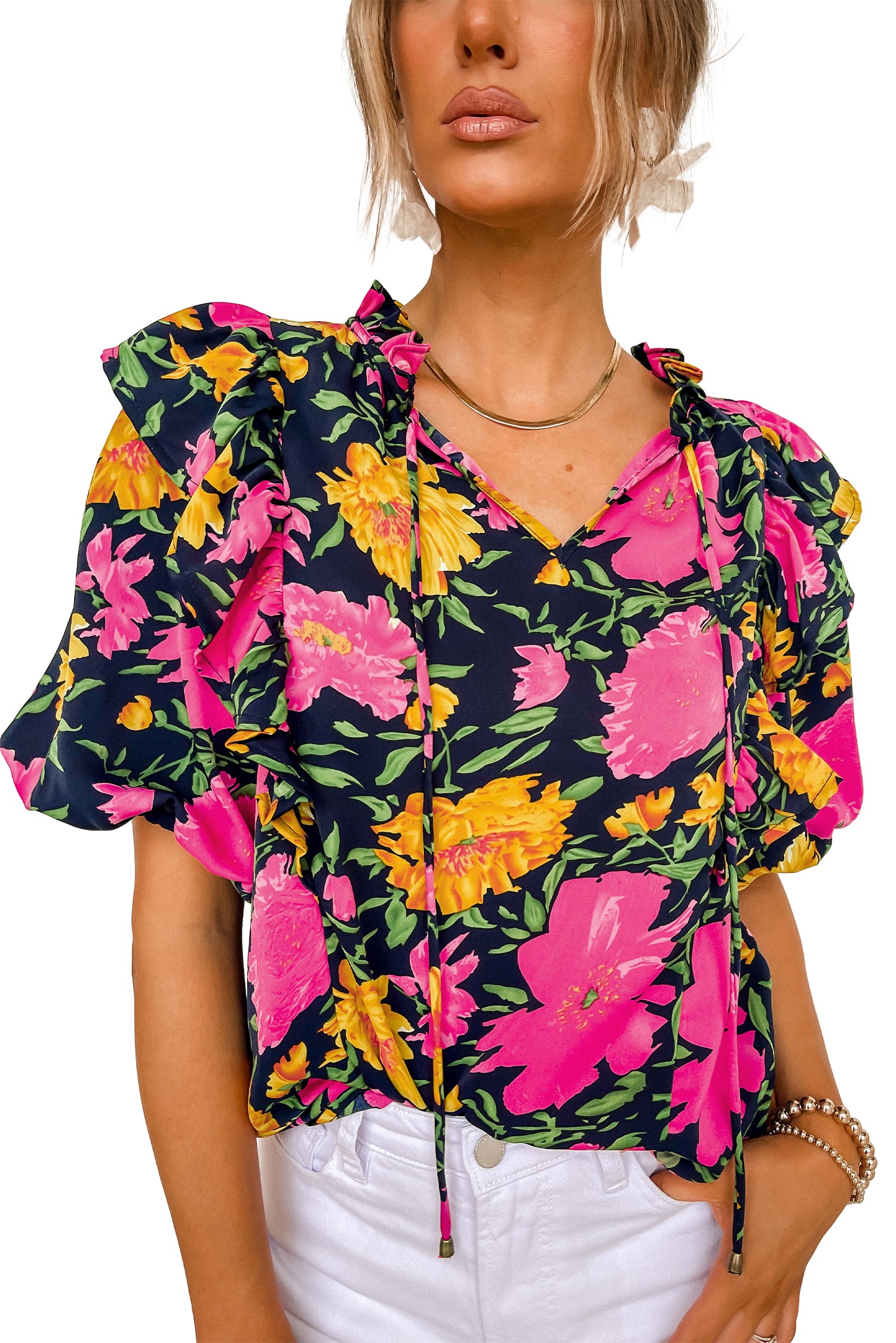 - The bubble sleeves and ruffled details add feminine touch to the blouse