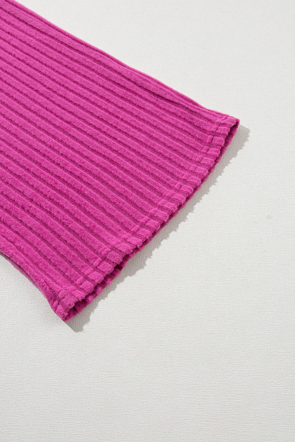 Rose Red Solid Color Ribbed Short Sleeve Wide Leg Jumpsuit
