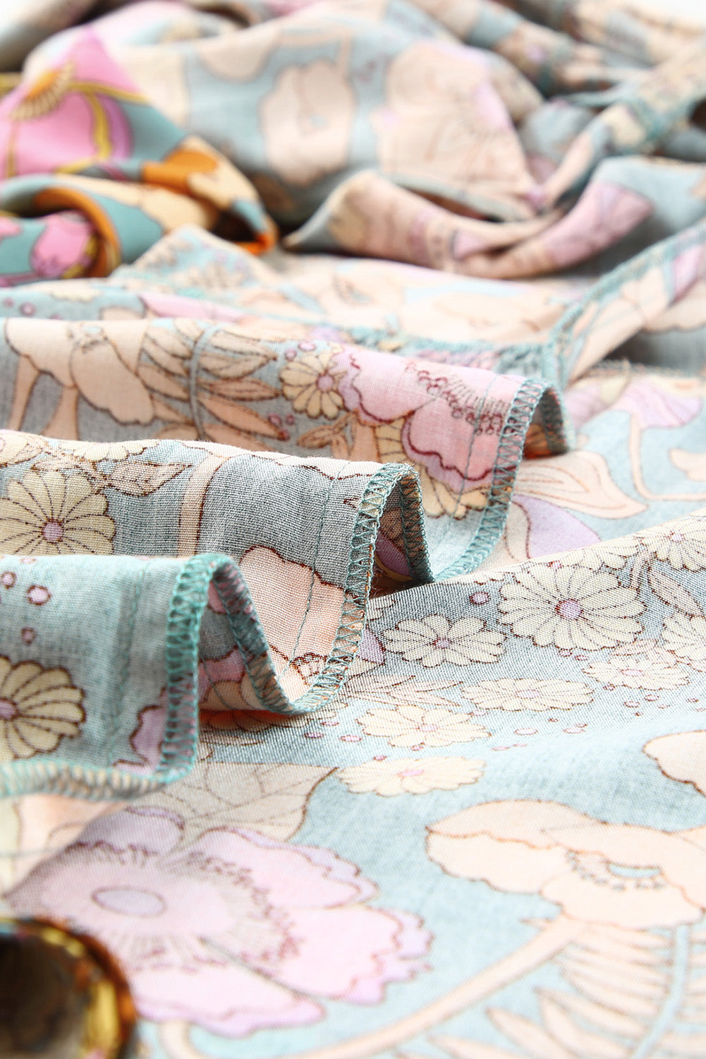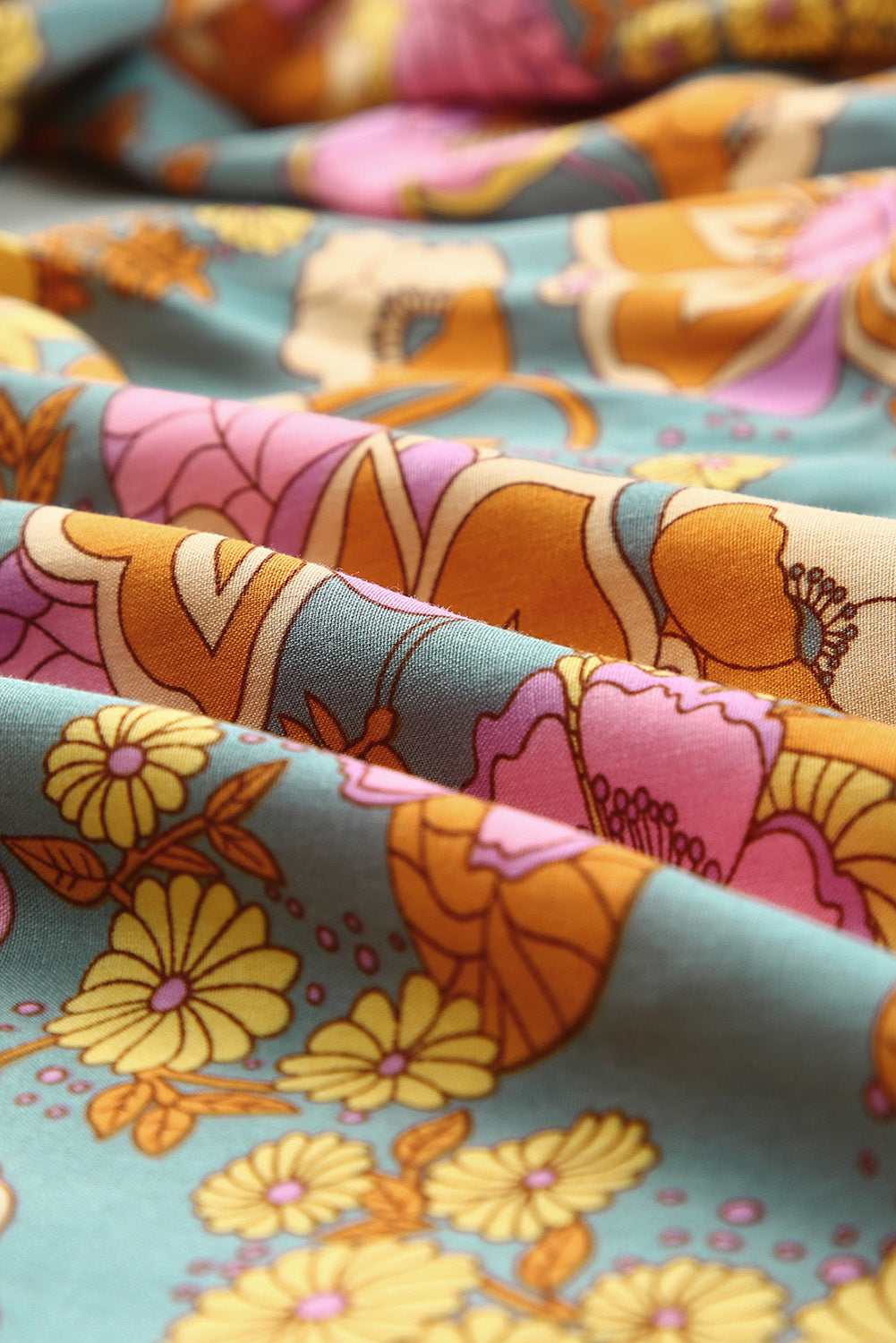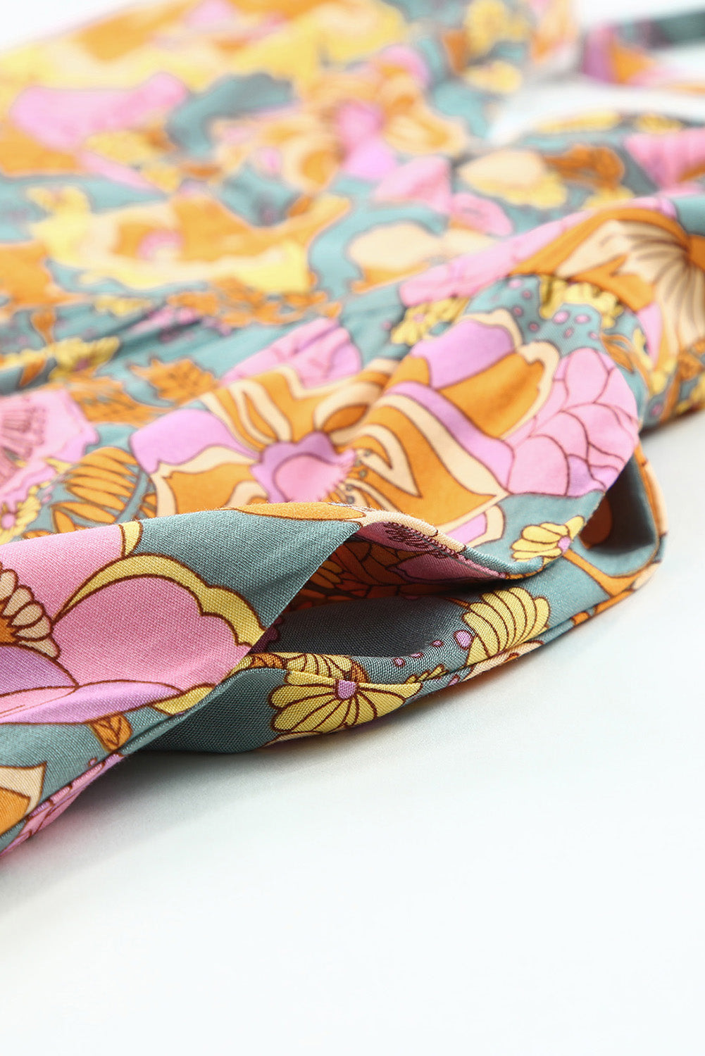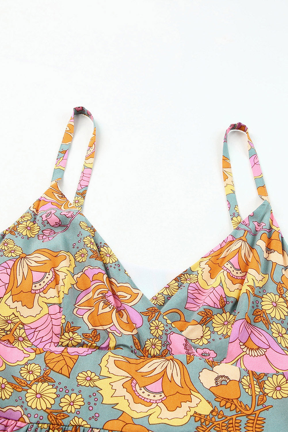 - This boho jumpsuit features lightweight material patterned with multicolor hued floral print