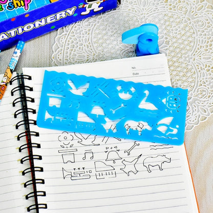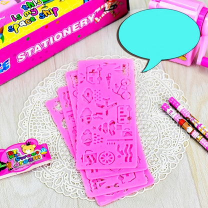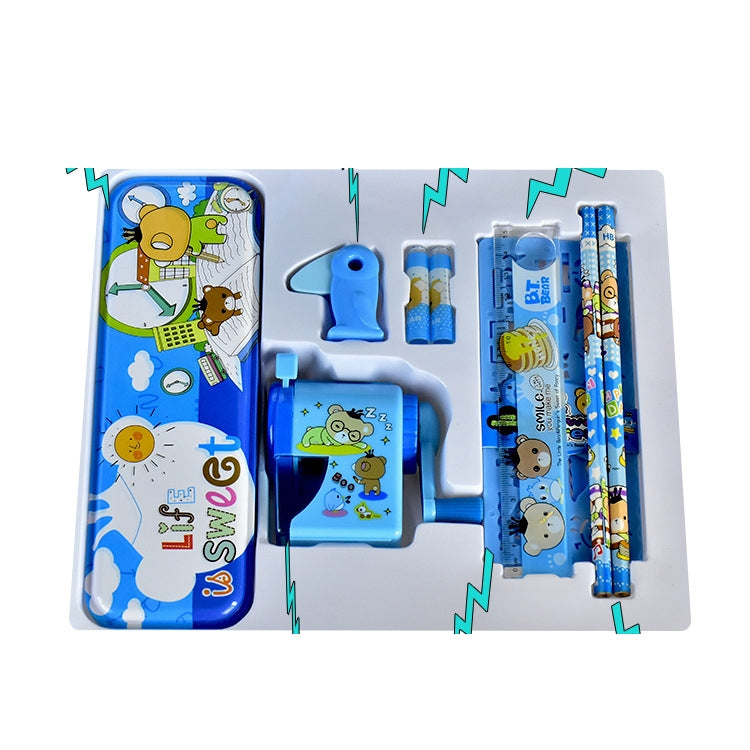 7. Contains: tinplate pencil case x1, woodpecker eraser x1, pen cap x2, magnifying glass ruler x1, pencil sharpener x1, drawing template x4, wooden pencil x2