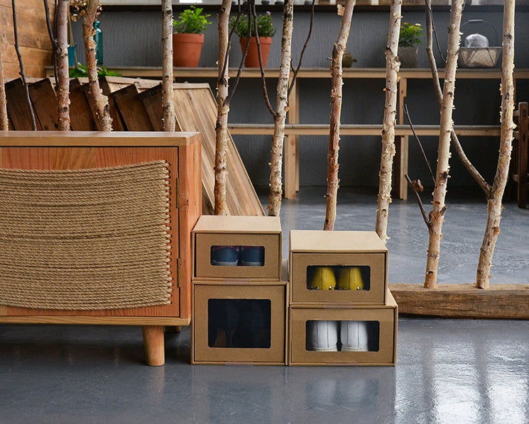 The Thicken Drawer Shoe Box is a durable and transparent shoe storage box made from high-quality kraft paper. Its thicken design ensures durability and stability, making it suitable for long-term shoe storage. The transparent construction allows you to easily view and identify your shoes without the need to open the box. The drawer-style design provides convenient access to your shoes, while also maximizing storage space in your closet or wardrobe. These shoe boxes are ideal for both men and women's shoes, helping to keep them protected from dust, dirt, and damage. Whether you're organizing your daily footwear or storing seasonal shoes, the Thicken Drawer Shoe Box offers a practical and space-saving solution for keeping your shoe collection tidy and well-maintained.