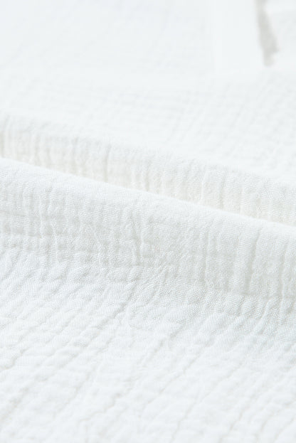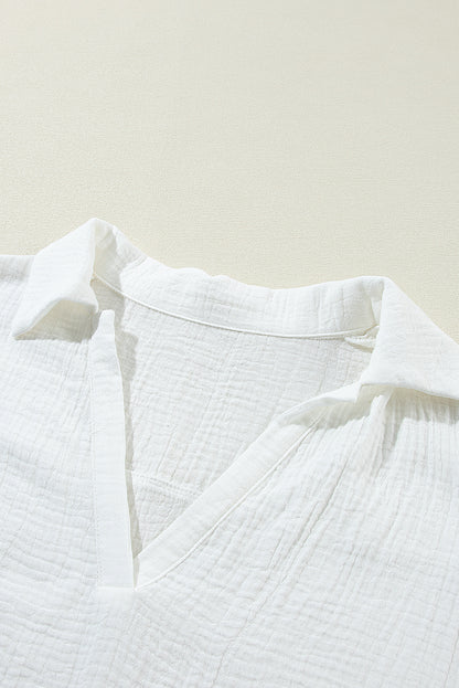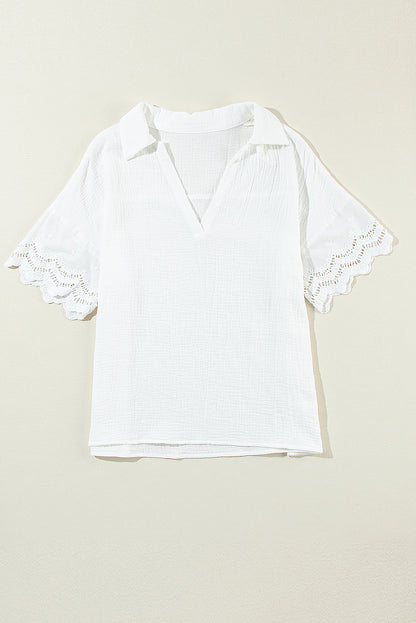 White Crinkled Lace Splicing Sleeve Collared V Neck Blouse
